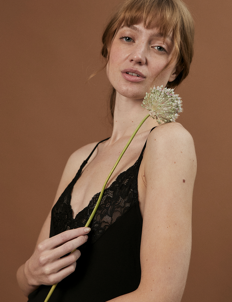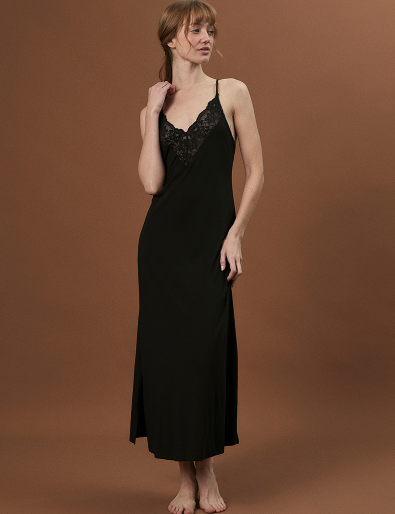 Meet our Cami Midi Bridal Black is a unique and romantic piece. It is characterized by a sophisticated back and lace on the neckline, a straight cut to the body with a long fall and, in addition, it has delicate adjustable straps to fit every body. Made in Pima Modal Cotton for softness and Luxury Finish; special fabric wash for a better feel on the skin and subtle drape that will give you a unique sensation.