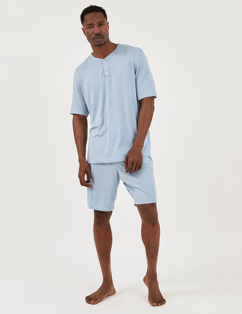 Discover the perfect summer sleepwear with the PJ Henley Corto Morning Sky. This thoughtfully designed set features a classic V-neck button-front henley paired with comfortable shorts that have an elastic waistband and adjustable drawstring. Crafted for all-day comfort at home, it's the ideal gift for the warm season ahead. Lightweight and breathable, this ensemble keeps you cool and relaxed from morning to night.